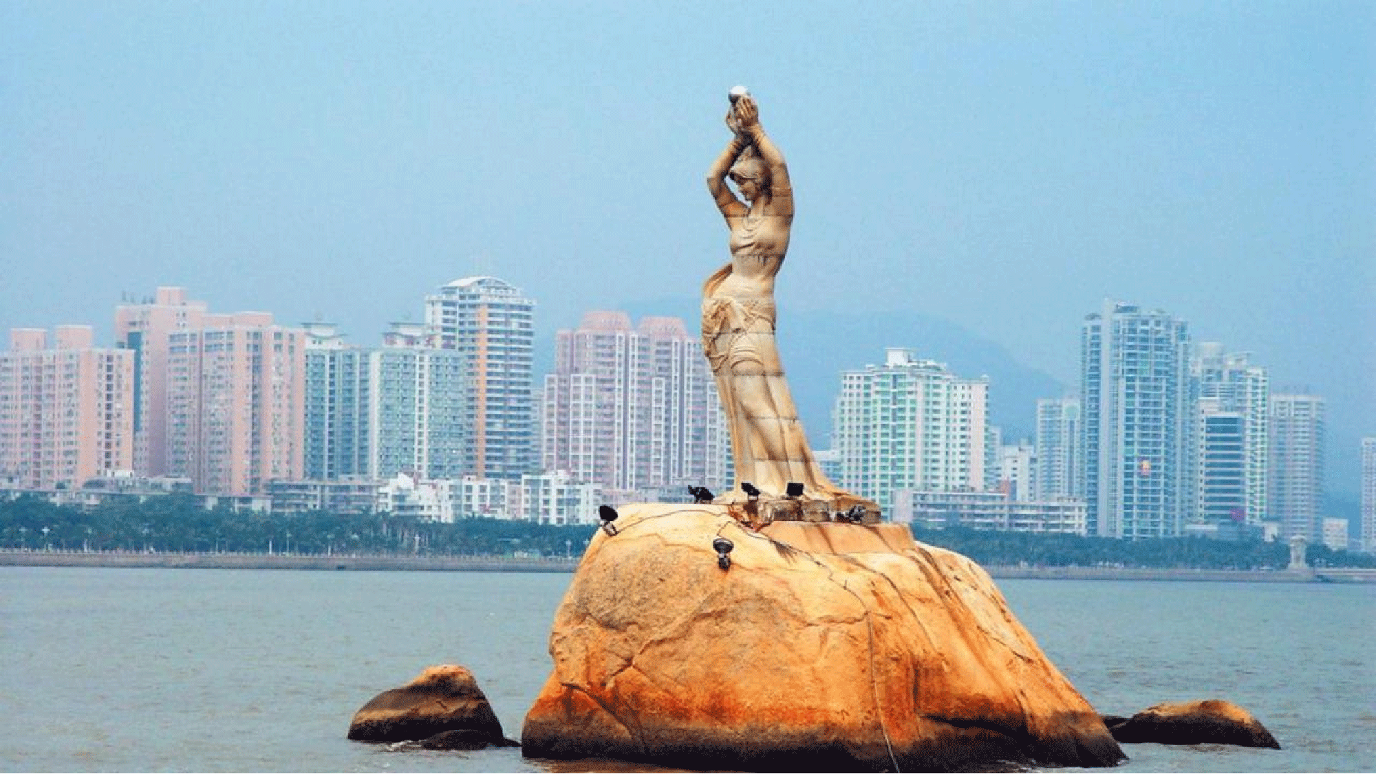 珠海市风景秀丽的香炉湾畔, 矗立着一尊巨型石雕──珠海渔女。 这座由中国著名雕塑家潘鹤根据南海渔民的美丽传说而设计制作的大型石 雕, 身高 8.7 米,重量达 10 吨, 用花岗岩分七十件组合而成。